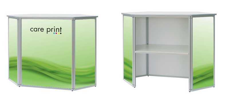 Die passende Präsentations-Theke zu unserer Faltwand. Die Theke ergänzt unsere Faltwand optimal. Ein Zwischenboden schafft Ablagefläche, die Seitenwände sind rundum bedruckbar.