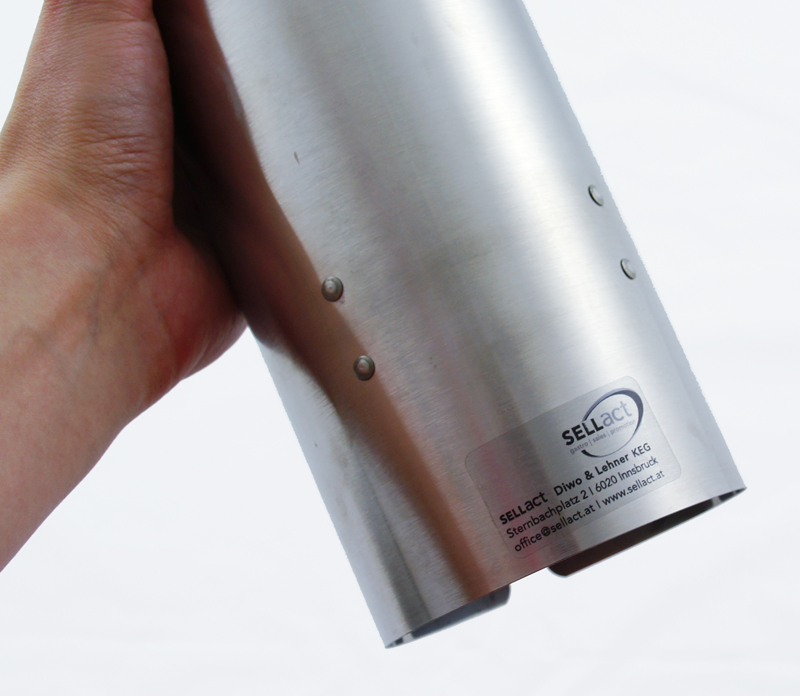 Unser Kunde, die Firma SellACT, ist der Spezialist wenn es um Trinkbecher geht. Dazu gehören natüclich auch Becherspender. Am Foto sehen Sie die Variante in Edelstahl, mit dem dazu passenden Aufkleber.